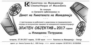 Меѓу наградите и признанијата сигурно посебно место зазема „Златниот објектив“, кој и беше доделен по повод Денот на Кинотеката на Македонија во 2017. Признанието „Златен објектив“ се доделува на поединци кои со своето професионално делување придонеле македонската кинематографија да се создаде, развива, промовира и популаризира.