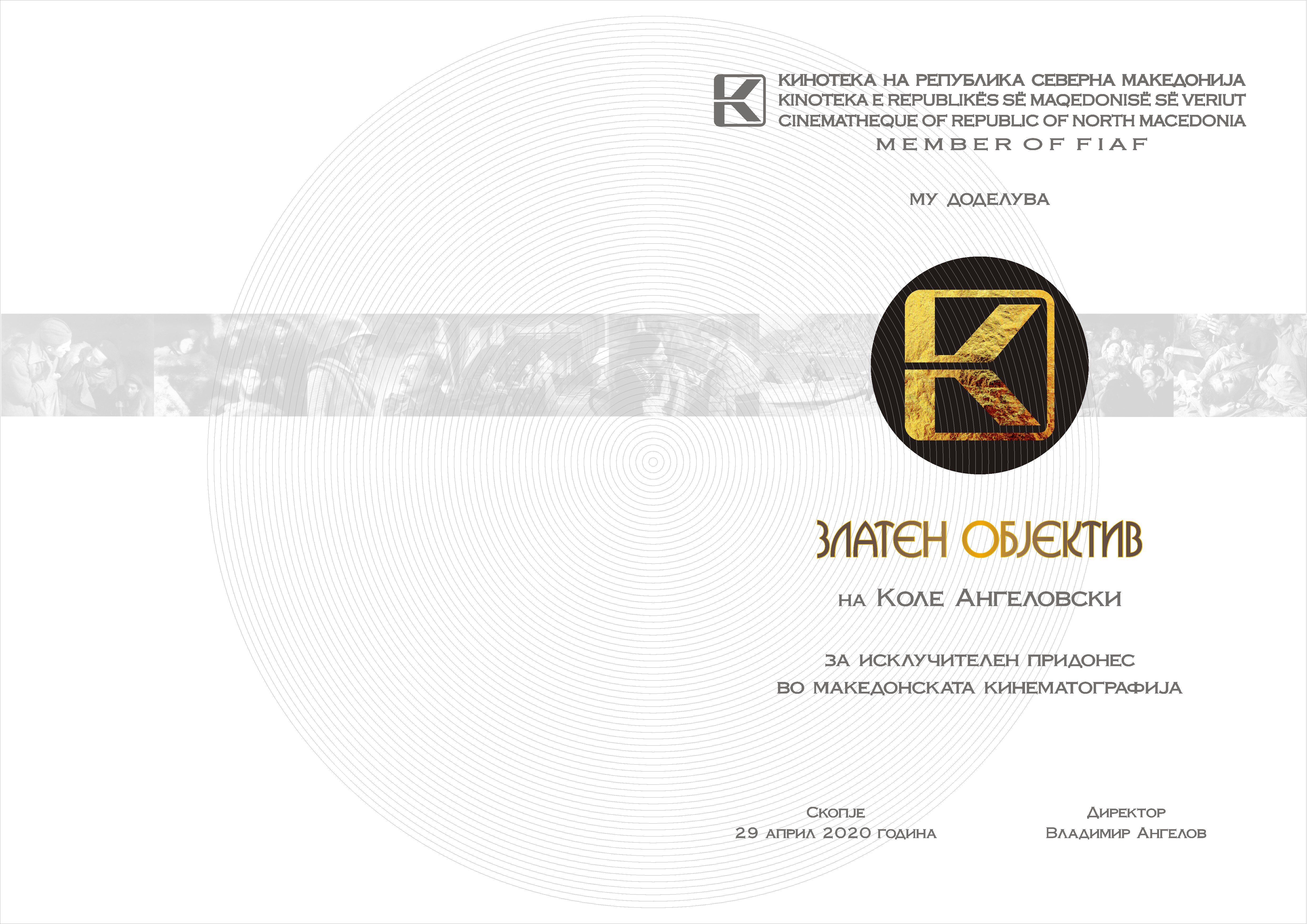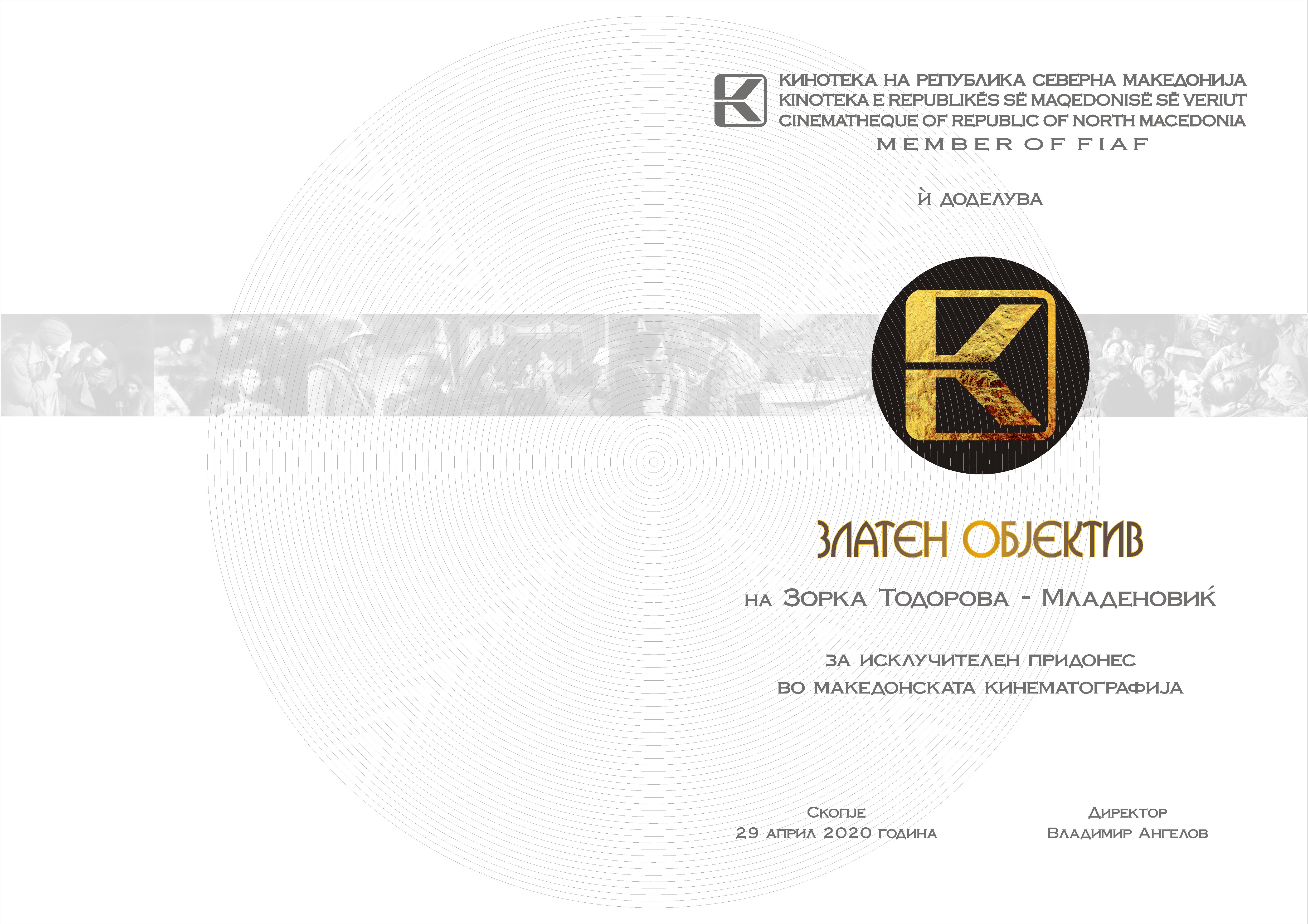 Управниот одбор на Кинотеката на Северна Македонија во март годинава одлучи дека актерот и режисер Коле Ангеловски и костимографката Зорка Тодорова-Младеновиќ се годинешните добитници на наградата „Златен објектив“ за 2020 година.