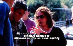 …Лето 1997 година. Потписникот на овие редови, тогаш новинар на неделникот „Екран“, заедно со фоторепортерот на „Екран“ Александар Ѓорѓиев и новинарот Јовица Трајковиќ, дописникот на загрепски „Глобус“, „Арена“ и другите изданија на „Еуропапрес холдинг“, заминуваме во прилепски Варош, каде што ја наоѓаме екипата на МИРОТВОРЕЦ. Ни објаснуваат дека следната сцена се снима во мариовско, некаде на патото пред Витолишта. Заминуваме со автомобилот на колегата Трајковиќ, и наидуваме на сетот каде што се подготвува сцената со колоната со камиони со екс-советски војници. Чудно за наши навики од снимањата филмови, сцената лично ја поставува Лустиг со директорот на фотографија и неговите асистенти. Филмскиот кран е подготвен за снимање. Одеднаш со голема брзина се приближуваат три црни „мерцедеси“ од класа „С“ (веројатно спонзори на продукцијата). Од еден излегува режисерката Мими Ледер, од останатите помошниците, асистентите, цела свита… Ледер му приоѓа на Лустиг, Лустиг и вели дека сè е подготвено за снимање на сцената. Ледер извикува „Action!“, камерите зујат (уште беа со филмска лента), по минута и нешто се слуша „Stop!“. Екипата на чело со Ледер си заминува со „мерцедесите“, а екипата предводена од Лустиг ја собира опремата од сетот. Колку што се сеќавам, можеби и не се снимаше дубл?! Веројатно затоа што сè било одлично подготвено.