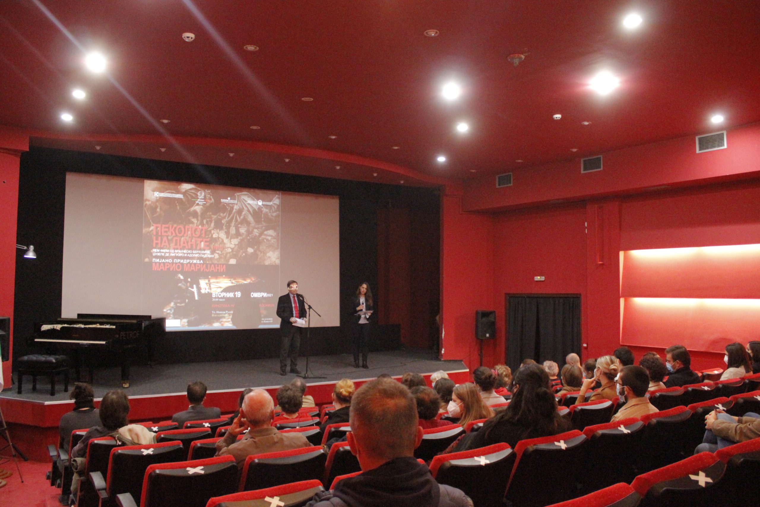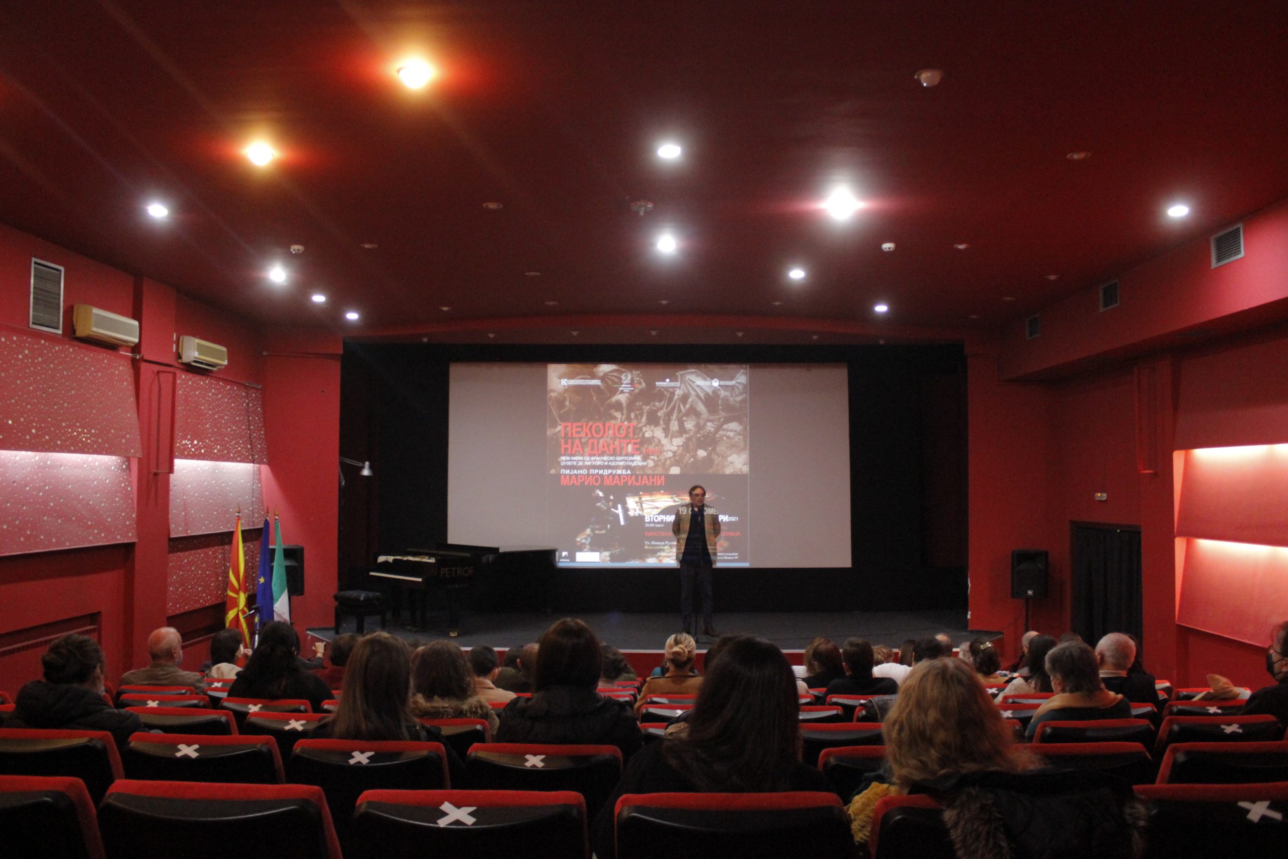Директорот на Кинотеката Владимир Ангелов го отвори настанот, поздравувајќи ја неговата екселенција амбасадорот на Република Италија во Република Северна Македонија, Андреа Силвестри (Andrea Silvestri), и присутните гости. Ангелов изрази големо задоволство што пијанистот Марио Маријани (Mario Mariani) по втор пат во Кинотеката „озвучува“ ремек-дело на италијанската кинематографија од немата ера, по КАБИРИЈА (Cabiria) од 1914 година на Џовани Пастроне (Giovanni Pastrone, познат и под псевдонимот Пјеро Фоско).