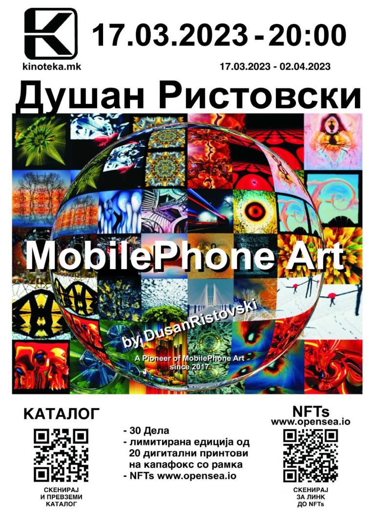 На 17 март (петок) со почеток во 20 ч. во галеријата на Кинотека ќе биде отворена изложбата Mobile phone art на Душан Ристовски. Пионерот на