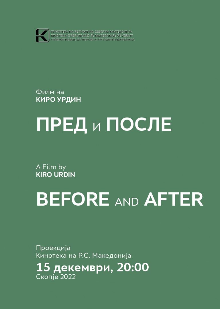 На 15 ДЕКЕМВРИ (ЧЕТВРТОК), 20:00 ч. на кинотечната програма е документарниот филм ПРЕД И ПОСЛЕ, по сценарио и во режија на Киро Урдин. ПРЕД И ПОСЛЕ
