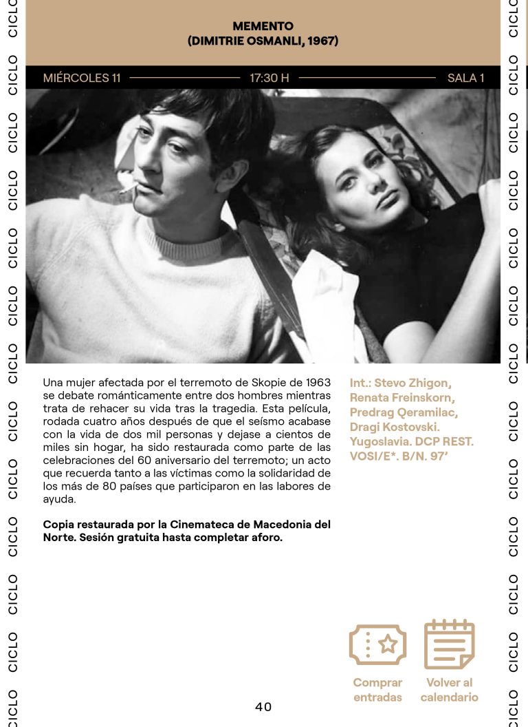 По одличниот прием во Музејот на современа уметност (МОМА) во Њујорк, македонскиот игран филм МЕМЕНТО на 11 октомври, среда, ќе биде прикажан и во Филмотека