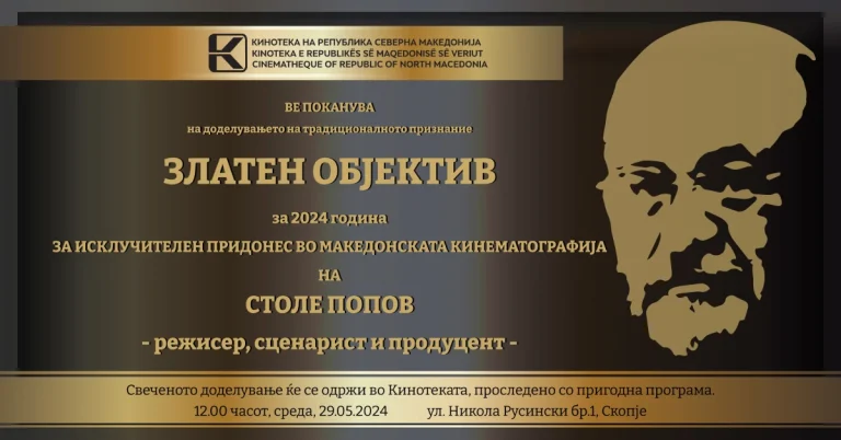Во среда, 29 мај, точно на пладне во киносалата на Кинотеката на Македонија ќе се одржи свеченото доделување на „Златниот објектив“ на големиот доајен на филмската уметност Столе Стојан Попов.