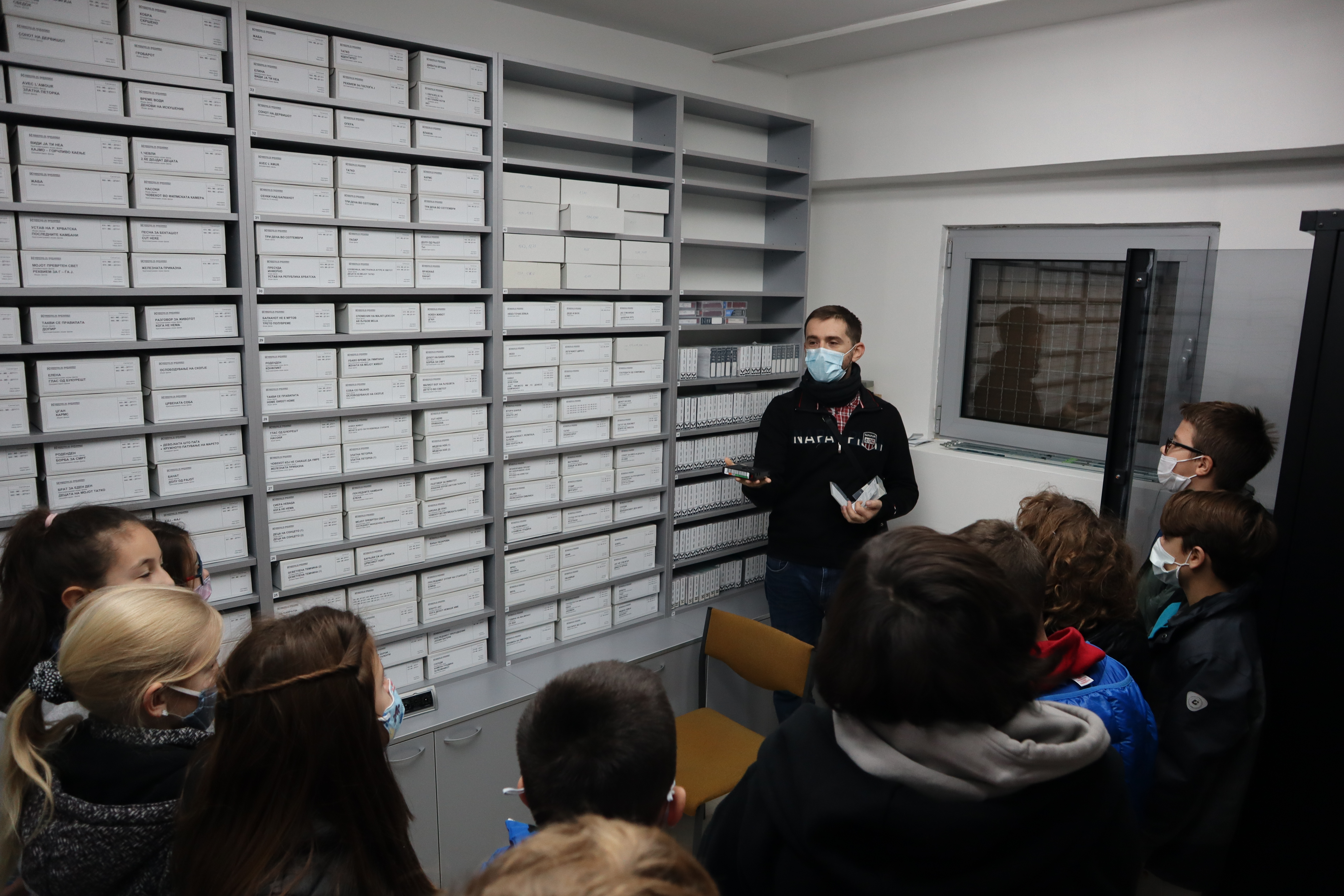 The filmologistLidijaKirovska spoke about the organizational set-up of the Cinematheque and the work of all three departments: the Department for collection, protection, processing, storage of audiovisual goods and film documentation (written and photographic documentation and museum exhibits), the Department for research, publishing and library activity, international , public activity and film program and the Department of administrative, legal affairs, human resources and material financial operations. Meanwhile, filmologistArsimLekskovica explained to the young visitors the work of the department for collecting, protecting, processing, storing audiovisual goods and film documentation.