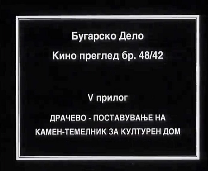 Репортажа со нарација во оф-тон, со текст што го чита спикер, за поставувањето камен-темелник на првиот културен дом во Македонија, во селото Драчево.