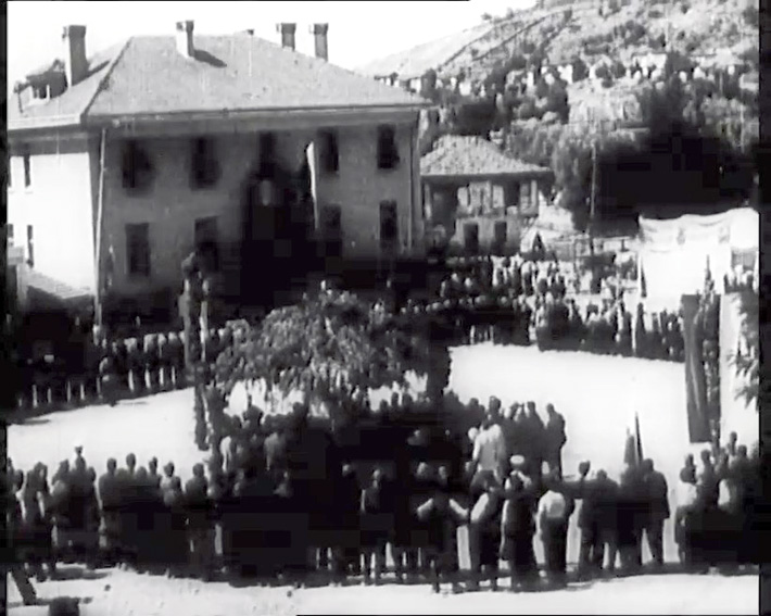 Репортажа со нарација во оф-тон, со текст што го чита спикер, за осветувањето на знамето на локалното друштво („месното дружество“) на Македоно-одринското ополчение (доброволци во Балканските војни), во Кочани, во 1942 година.