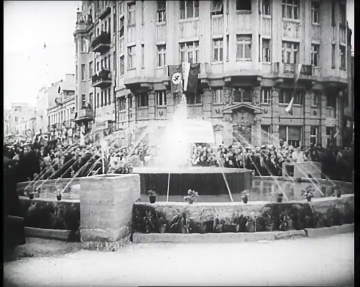 Репортажа е целосно реализирана во с. Страцин, Кратовско и Скопје, кон средината на април 1943 година и е посветена на посетата на германскиот амбасадор во Царството Бугарија, Адолф Бекерле, при што тој открива чешма-споменик во с. Страцин во чест на загинатите германски војници, ги поздравува присутните на скопскиот плоштад, положува венец со цвеќе на германските воени гробишта во Скопје и добива диполома и златна значка за почесно граѓанство на Скопје во Народниот театар. Покрај гласот на нараторот, во оф-тон, како илустрација, се слушаат и извиците „Ура!“ од страна на војската и граѓаните на плоштадот, како и соодветно оркестрирана воена и класична музика.