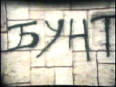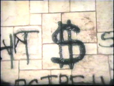 На ѕид испишан е графит „БУНТ“. Доаѓа момче и со спреј пишува „ДОЛУ ПРИВАТНАТА СОПСТВЕНОСТ“ и знакот „$“.