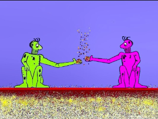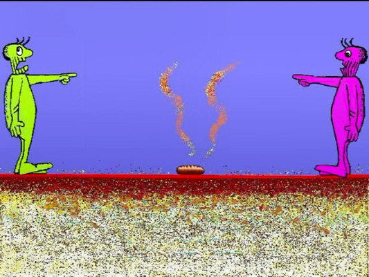 Цртан филм работен со компјутерска техника. Прикажана е природа, а во офтон се слуша пеење на птица. Двајца мажи се во потрага по храна. Здогледуваат една векна леб, која паѓа од небо. Започнува борба кој ќе ја земе за себе.