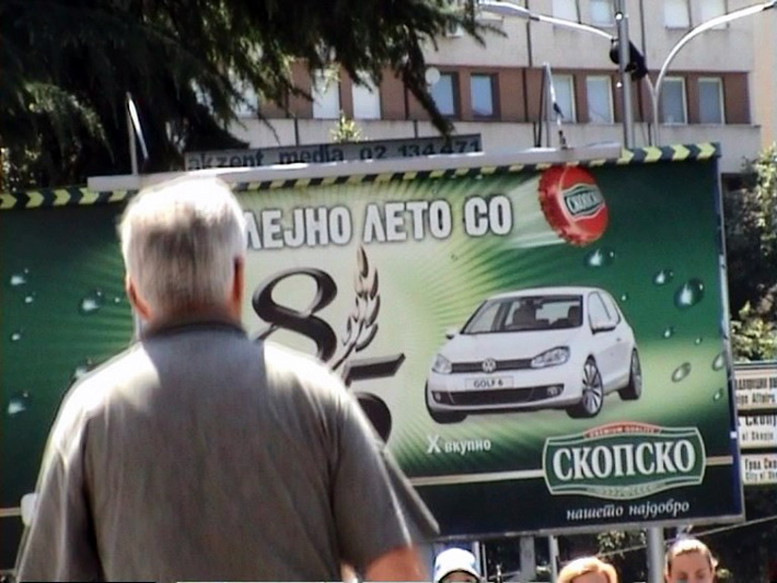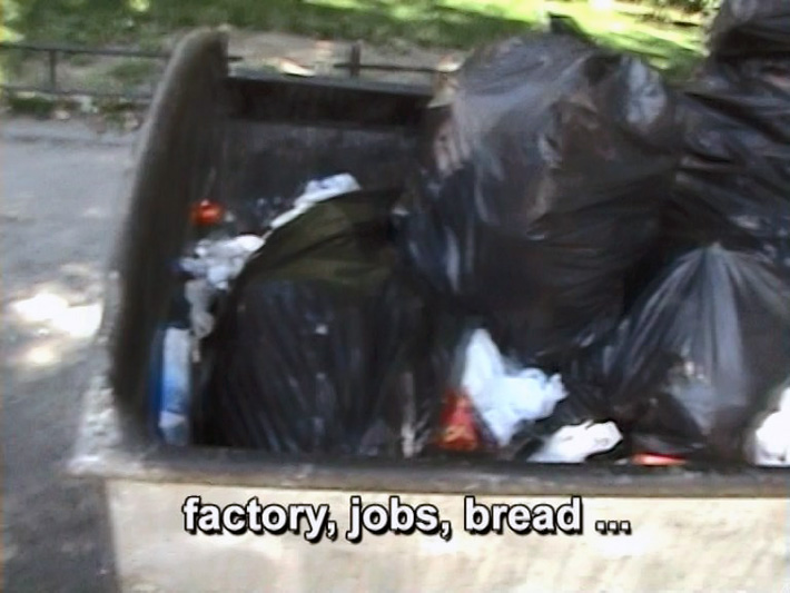 Наизменични кадри од котејнер со ѓубре и паради со слоганот „Пролетери од сите земји, обединете се“, снимени во центарот на Скопје. Прикажани се Собранието и Владата на Македонија и многуте реклами низ градот. Во офф-тон се слушаат химната на Македонија и „Црвено знаме“ (Bandiera rossa).