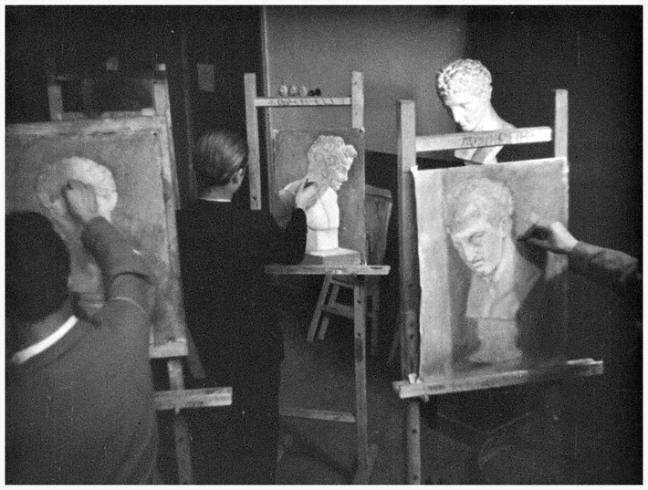 Прилогот содржи 30 кадри снимени во новоотвореното Уметничкото училиште во Скопје, 1945 година. Најнапред е прикажано изучување и давање на упатства за правилно совладување на сликарските и вајарските техники. Во последните кадри се користени крупни планови со цел да се детализира реализацијата на ликовните форми.