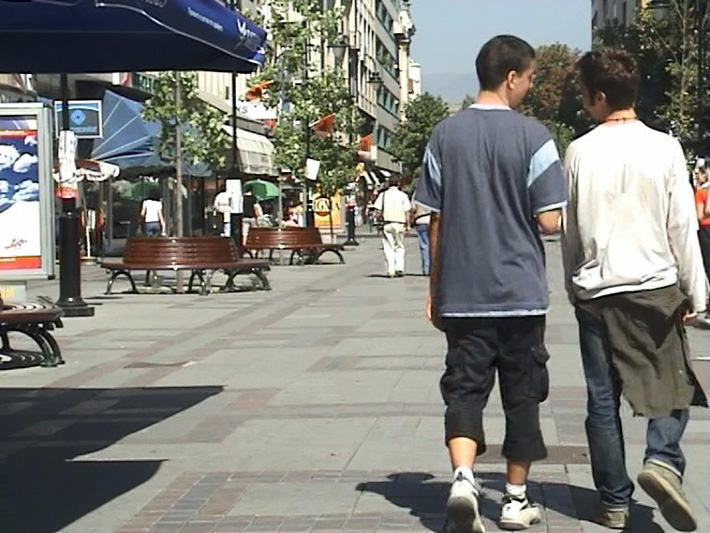 Две млади момчиња разговараат. Незадоволни се од државата во која живееат. Се шетаат на улица „Македонија“ во центарот на Скопје. Палат цигари и продолжуваат да одат низ градот. Разговорот го продолжуваат во кафуле. Сакаат да се иселат во странство за да имаат подобар живот. Едното момче се качува на воз и заминува, другар му мавта со рака од перонот.