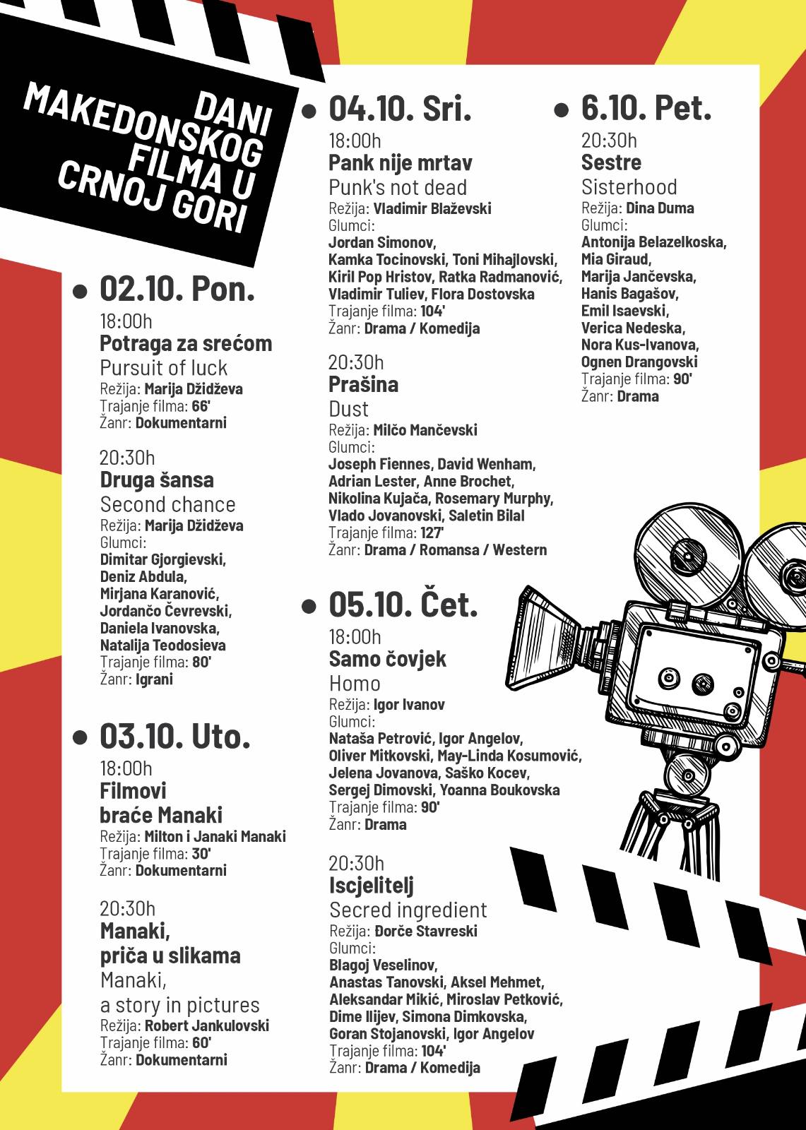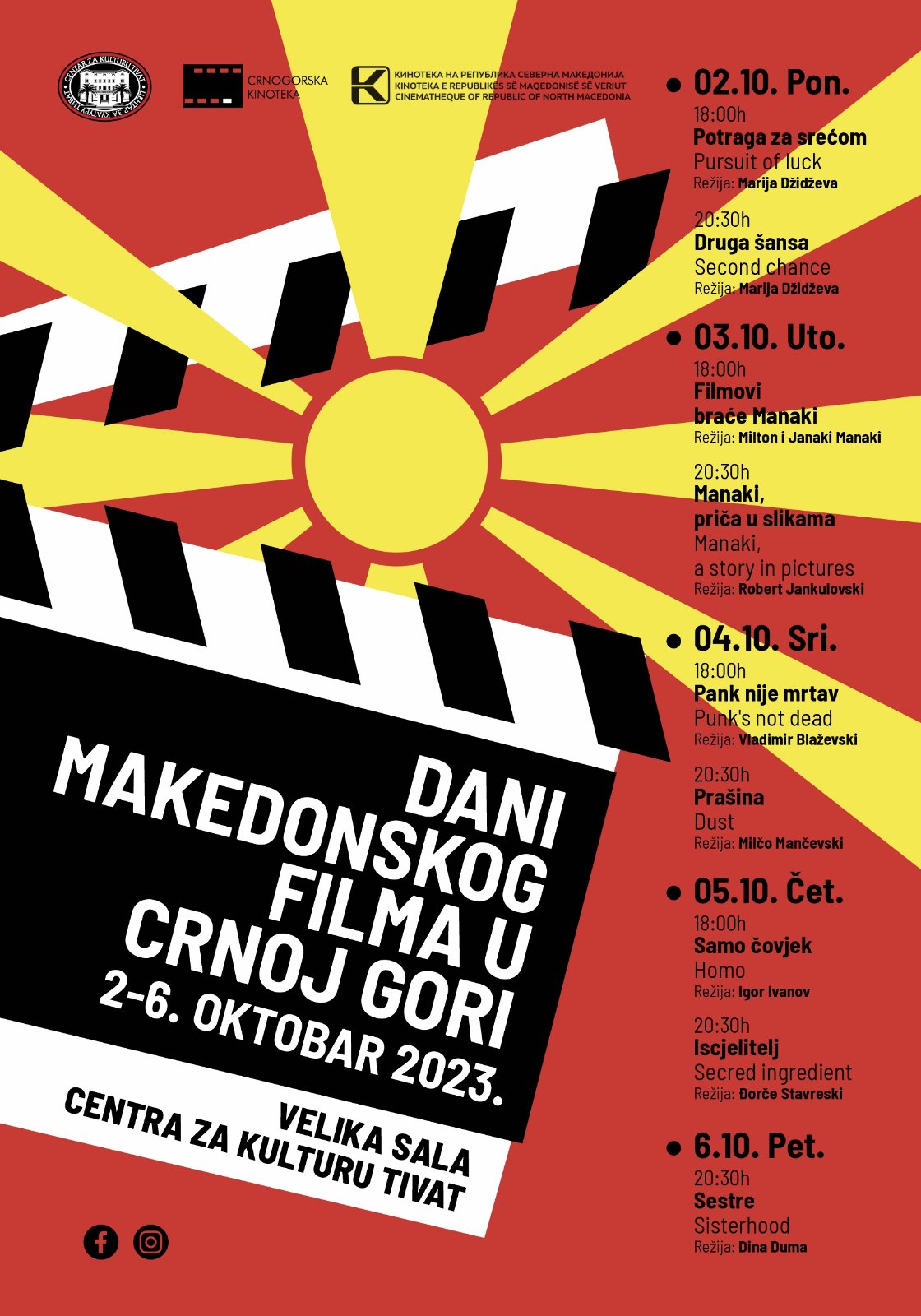 Ky aktivitet përfshin programin e përzgjedhjes së filmave nga Kinoteka e Republika e Maqedonisë së Veriut, dhe do të zgjasë nga 2 deri më 6 tetor. Publiku malazez do të ketë mundësinë të shikojë edhe një film tjetër të Marija Xhixhevës – dokumentarin KËRKIMI I LUMTURISË (2010), pastaj një përzgjedhje e filmave të vëllezërve Manaki nën titullin MANAKI, TREGIM NË FOTO, si dhe filmat artistikë. PUNK NUK ËSHTË I VDEKUR (2011) nga regjisori Vladimir Blazhevski, PLUHUR (2001) nga Millço Mançevski, HOMO (2020) nga Igor Ivanov-Izi, SHËRUES (2017) nga Gjorçe Stavreski dhe MOTRA (2021) nga Dina Duma.
