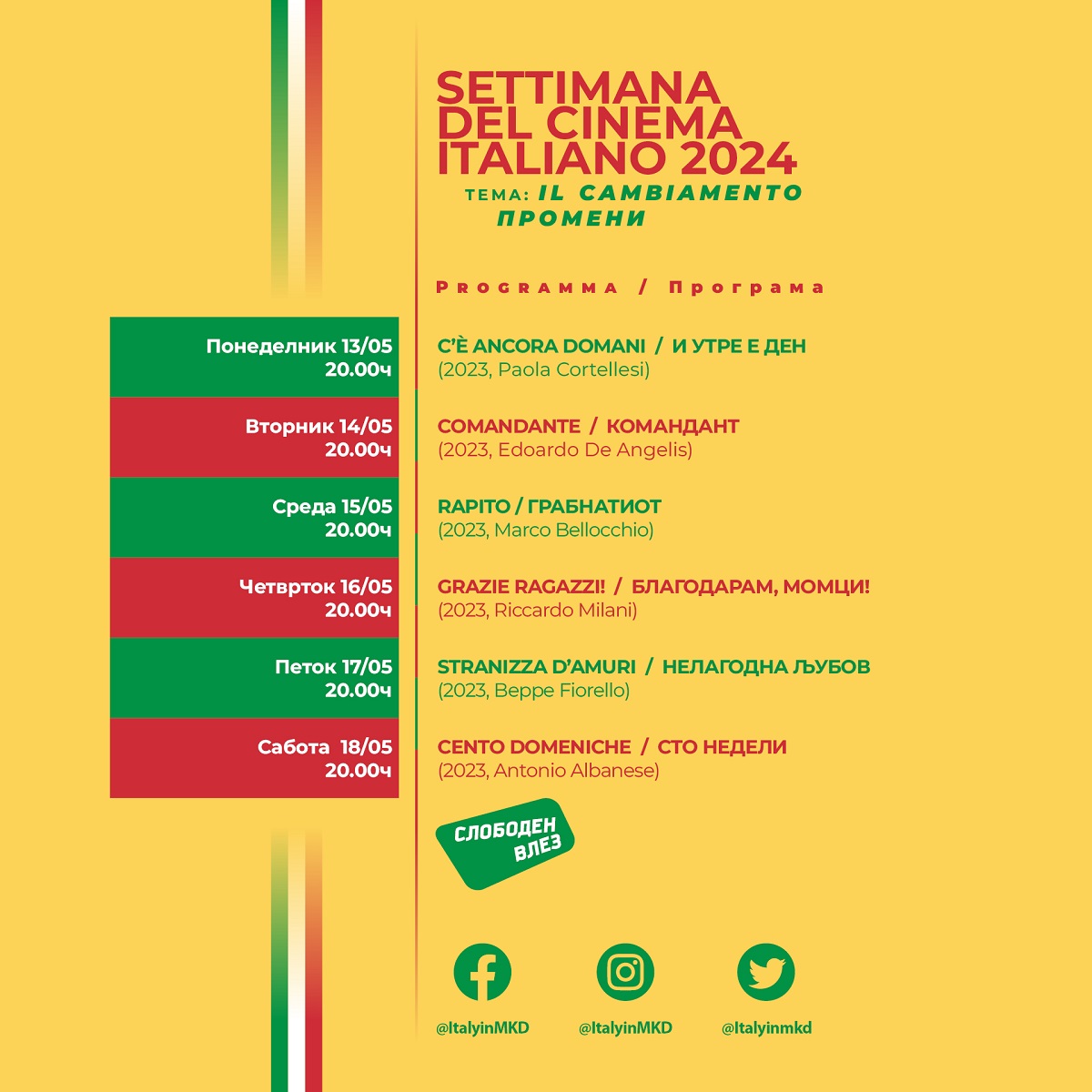 Dal 13 al 18 maggio si svolgerà presso la storica “Kinoteka na Republika Severna Makedonija” di Skopje la XXIV edizione della “Settimana del Cinema Italiano”. La rassegna offrirà una selezione di sei film tra i più rappresentativi della produzione cinematografica italiana contemporanea – si tratta infatti di pellicole tutte uscite nel 2023 che hanno ricevuto numerosi prestigiosi premi nazionali ed internazionali – e sarà declinata attorno al tema del “cambiamento” a partire da situazioni impreviste, relazioni inaspettate, scelte personali, mutamenti storici e sociali ed esperienze artistiche.